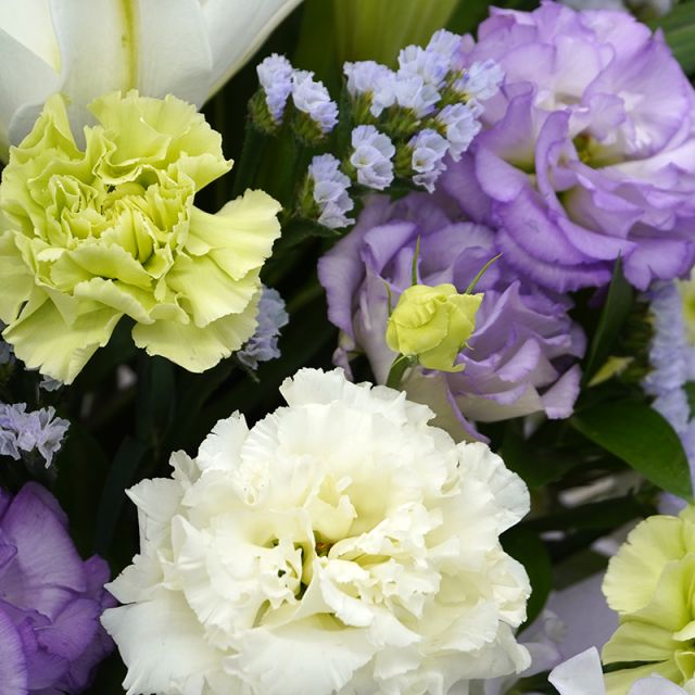 花 材 トルコギキョウ、カーネーション、百合、季節の小花、季節のグリーンなど。地域や季節で花材がかわります。